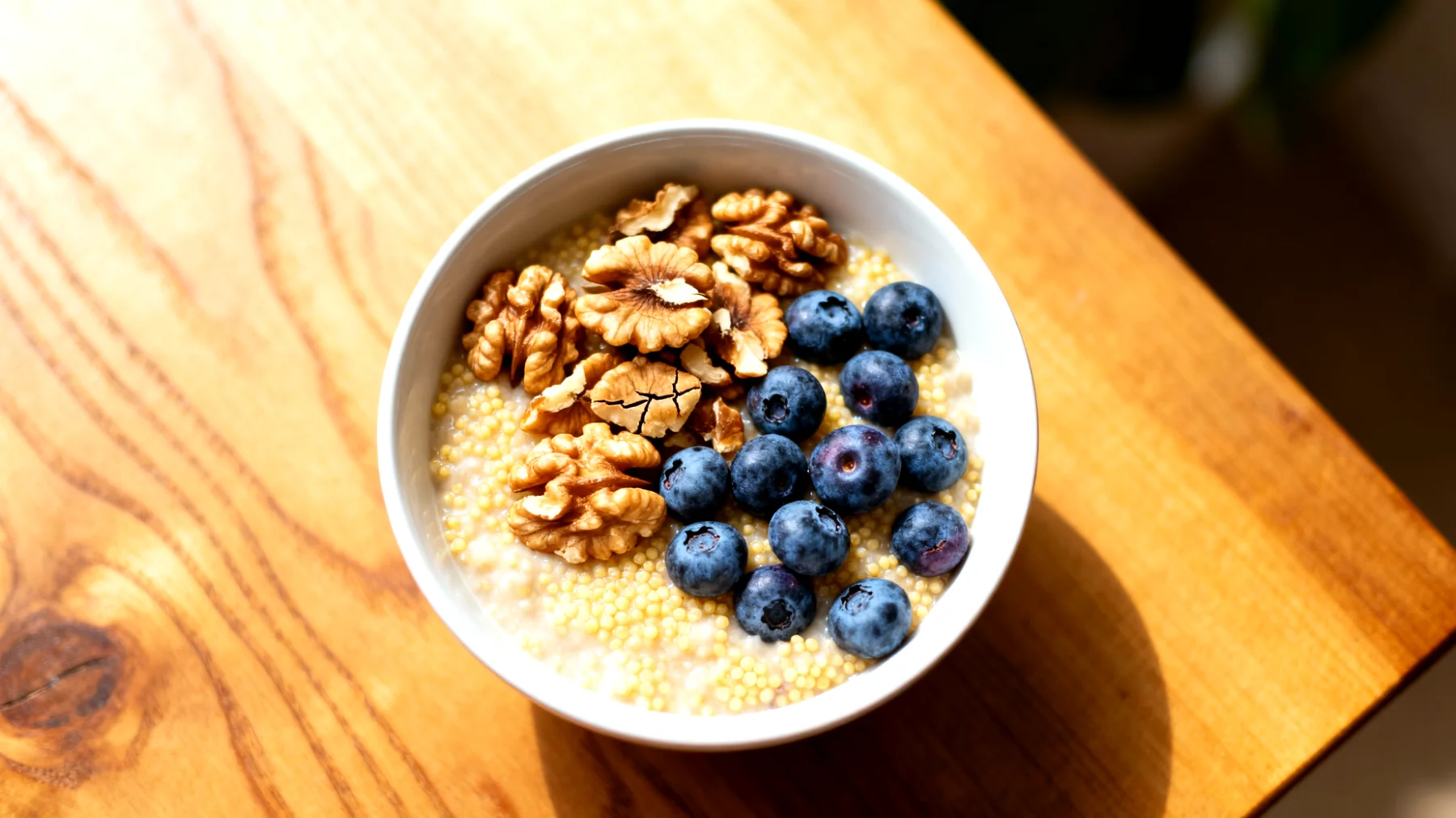 Hirse-Porridge mit Walnüssen und Blaubeeren ist weit mehr als ein modisches Frühstück. Es ist eine durchdachte Nährstoffkombination, die gezielt die Anforderungen eines konzentrierten Arbeitstags unterstützt. Die nachweisbaren Vorteile sprechen für sich: B-Vitamine für den Nervenstoffwechsel, Eisen für den Sauerstofftransport, Omega-3-Fettsäuren für die Gehirnfunktion, Anthocyane für den Zellschutz und komplexe Kohlenhydrate für stabile Energie über mehrere Stunden.